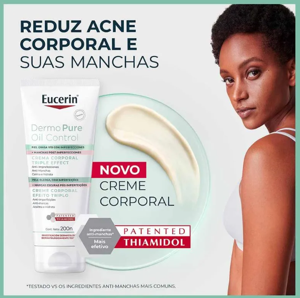 O Creme Corporal Eucerin Dermo Pure Efeito Triplo 200ml é um produto corporal desenvolvido para quem busca cuidado para áreas do corpo com tendência ao surgimento de marcas e irregularidades causadas por acne. Oferece benefícios em três frentes, combinando efeitos que contribuem para uma aparência mais uniforme e sensação de conforto na pele.