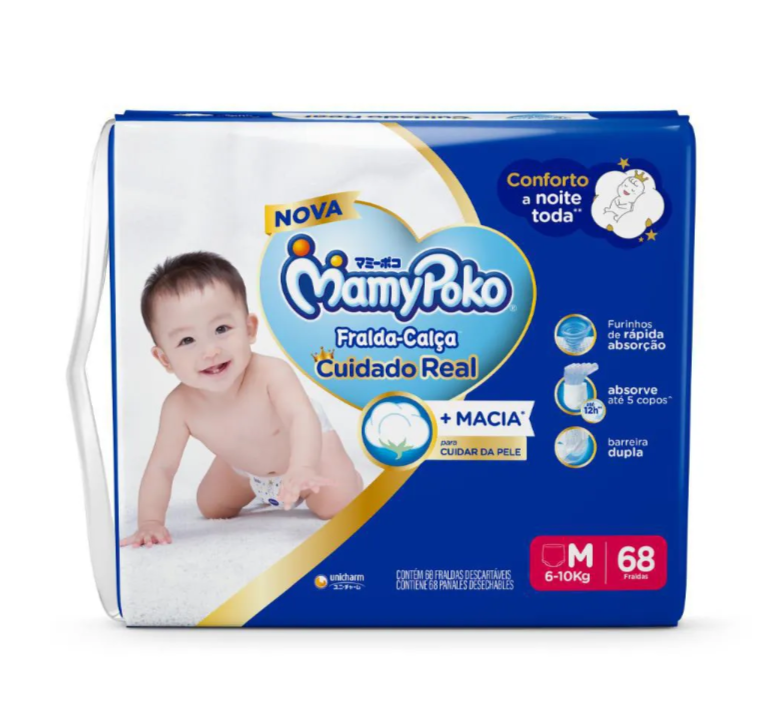 A MamyPoko é reconhecida pela alta qualidade e conforto que oferece aos bebês. Esta fralda-calça garante proteção prolongada, toque macio e um ajuste firme que acompanha cada movimento, proporcionando segurança durante o dia e a noite.