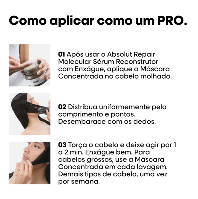 Após o shampoo, aplique a máscara nos cabelos úmidos, do comprimento às pontas. Deixe agir de 1 a 2 minutos e enxágue completamente. Use com frequência conforme a necessidade dos fios.