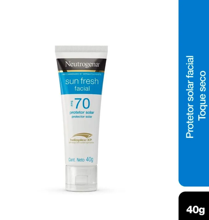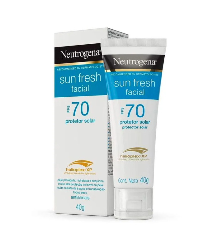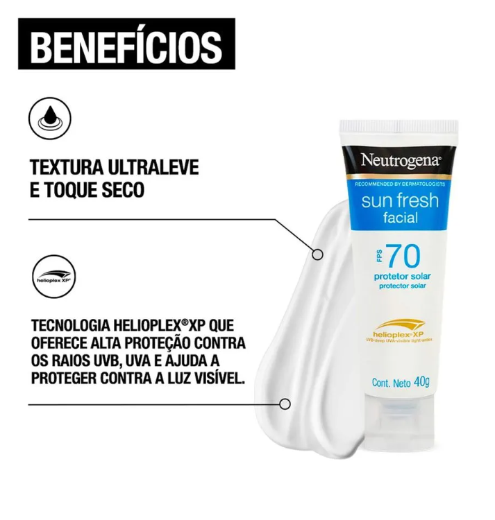 O Neutrogena Sun Fresh Protetor Solar Facial FPS 70 40g é indicado para proteção diária da pele contra a exposição ao sol. Desenvolvido para uso facial, possui textura leve e rápida absorção, proporcionando acabamento confortável e sem sensação oleosa.