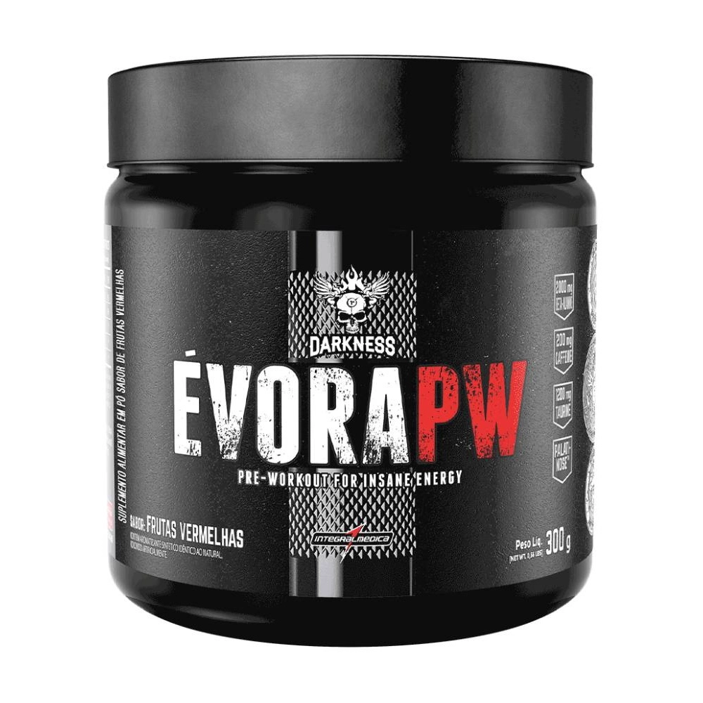 informações do produto O Pré-Treino Évora pw Darkness é um poderoso pré-treino que traz em sua formulação os principais ativos para potencializar seu treino, sua força e seu rendimento.Com a combinação perfeita de Beta-Alanina, Cafeína, Taurina e Palatinose, o Évora pw é para você que busca maior foco durante os treinos, aumento extremo de energia, aumento na resistência muscular, redução da fadiga e busca a alta performance.Cada um de seus componentes foi pensado para potencializar seu treino: Beta alanina que aumenta a força, performance e recuperação física de forma gradativa, a cafeína que proporciona o aumento da energia, melhora do foco mental e aumento da força física, a taurina que atua no sistema nervoso auxiliando na potencialização do foco e diminuindo a ansiedade em atletas de alta performance e a palatinose, um carboidrato de absorção lenta que auxilia no ganho de massa muscular e a manutenção de massa magra.Ingredientes: Beta-alanina, taurina, isomaltulose (Palatinose), cafeína, aromatizante, acidulante ácido cítrico, antiumectante dióxido de silício, edulcorante sucralose e corante artificial tartrazina.Sugestão de consumo: 1 dosador (1 Porção de 5g) antes do treino.Sobre o Vendedor: A G7 Nutrição Esportiva é uma das maiores empresas no ramo de suplementos do Brasil. Desde de 2003 atuando no mercado de suplementação, contamos com mais de 11 lojas no interior de São Paulo. é distribuidora oficial dos maiores laboratórios, priorizando sempre a excelência e qualidade dos produtos. Nossa missão é atender à necessidade dos nossos clientes e superar a suas expectativas. ficha técnica Código de barras 7896311770830Marca Integralmédica Fabricante Integralmédica Peso Aprox Prod Eletro 0.35Peso Produto5561 0.35Sabor Uva,Maçã Verde,Limão,Frutas Vermelhas,Frutas Amarelas